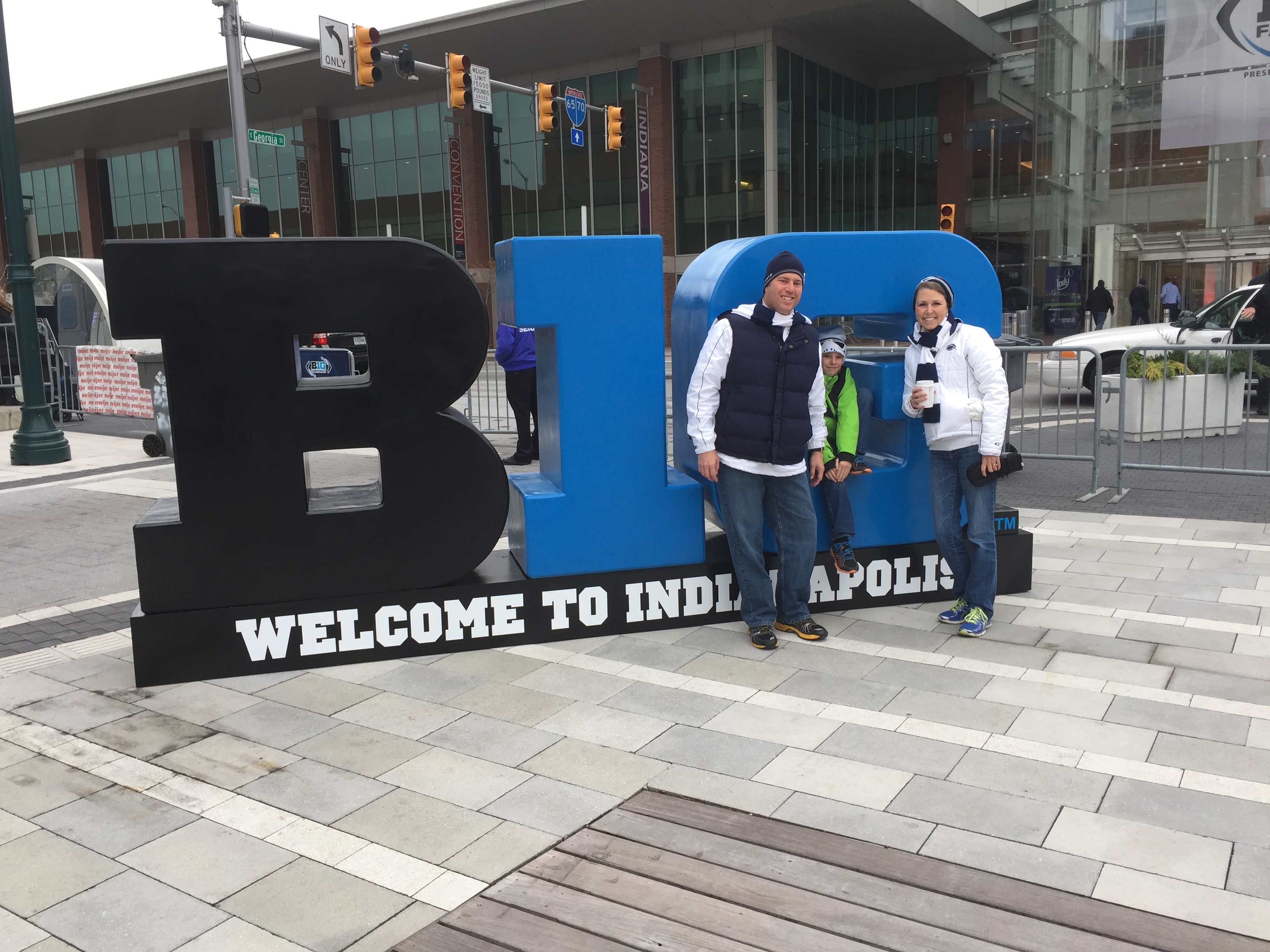 Lots of PA license plates and Penn State car magnets surrounded us as we made the pilgrimage in the wee hours of the night. My guys awoke early with the news that ESPN GAMEDAY team was in town for the Big Ten Championship. So, we headed out to explore after getting mom’s coffee. What a welcoming, friendly, walkable city we found in Indianapolis! With a little effort and a seat on Dad’s shoulders, my son is proud to say that he was on TV during ESPN GAMEDAY behind Desmond Howard’s head. His grandparents saw it live while remote DVR recording from our phone came in very handy. Zack and Dez had a connection that would follow them to Pasadena a month later. (I’ll take credit for suggesting the green coat to help him stick out in the sea of white and red.)